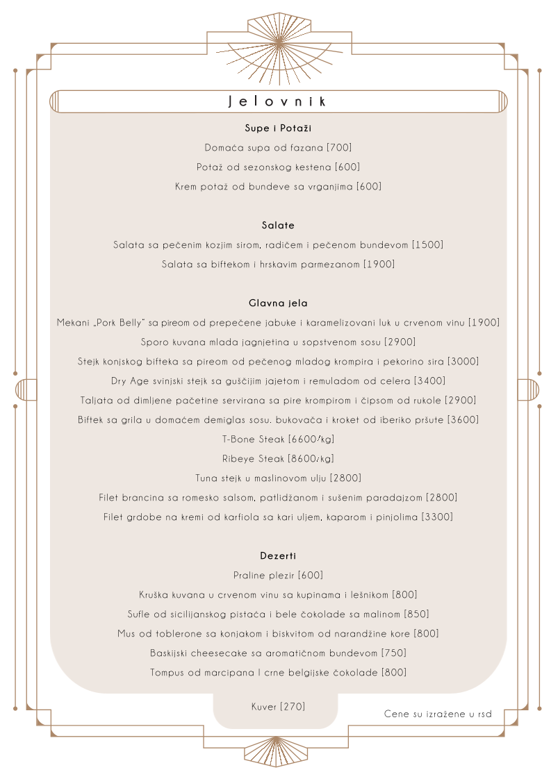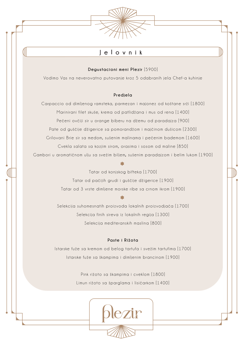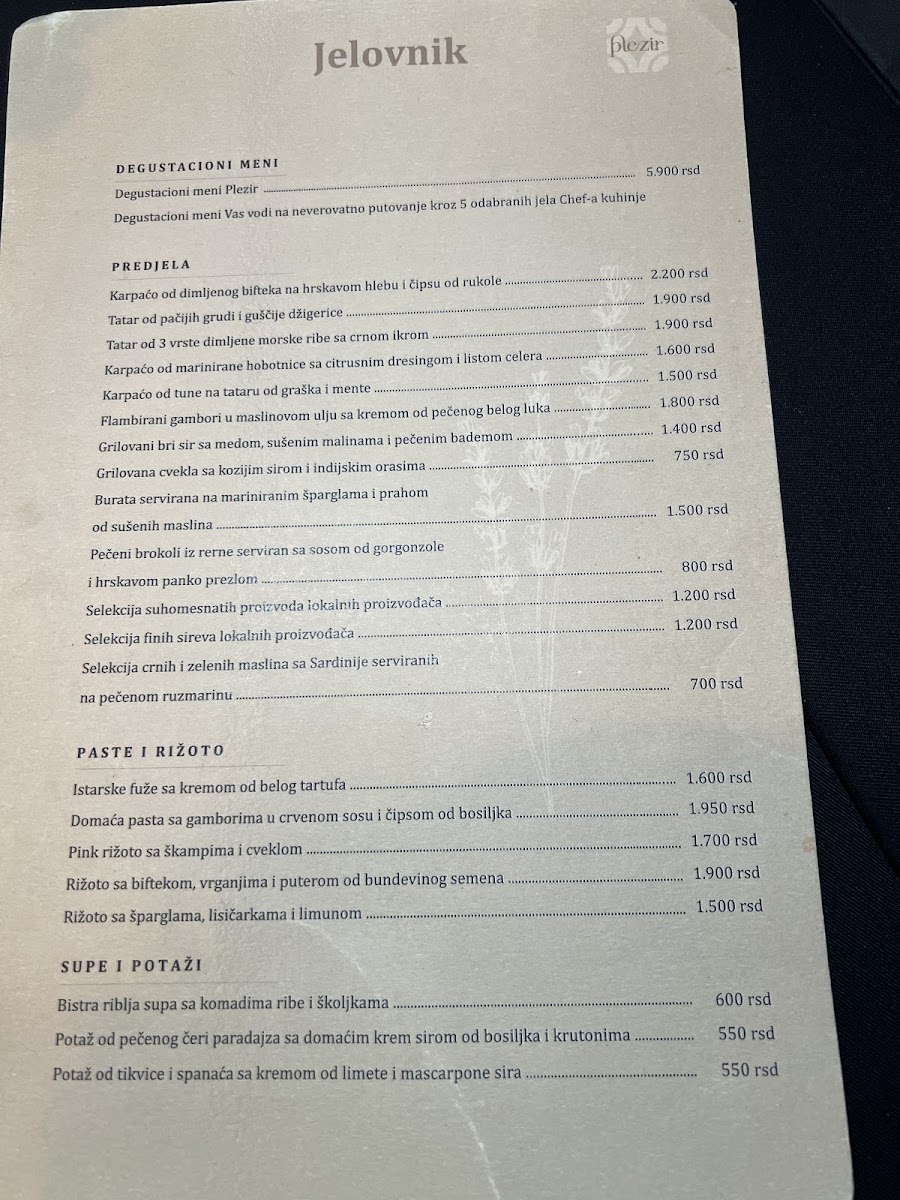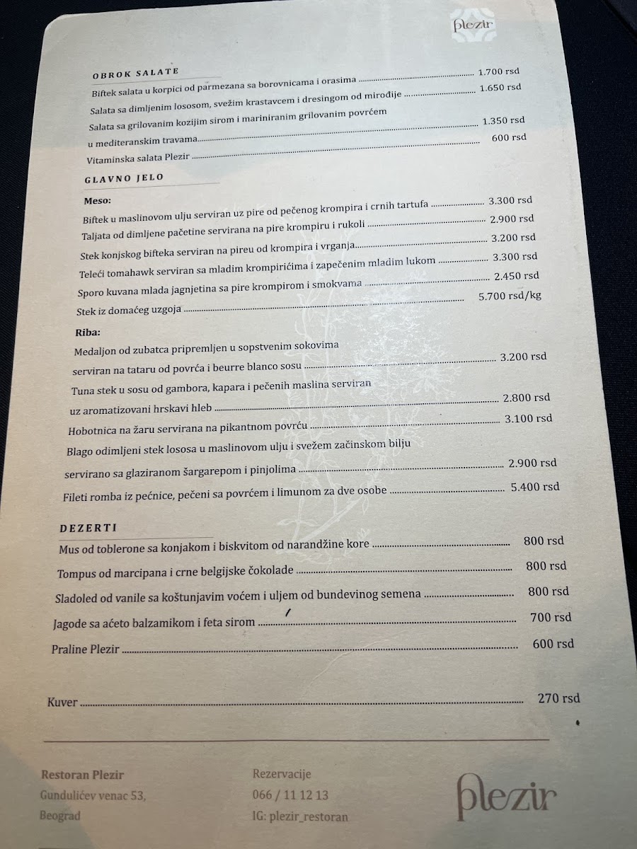 At Plezir Restoran, the menu is a delightful fusion of traditional and contemporary flavors, offering a refined dining experience in the heart of Belgrade. Among the standout dishes, the T Bone Steak takes center stage, offering a perfectly grilled cut of meat with a rich, smoky flavor that promises to satisfy even the most discerning carnivores. For a unique twist, the Taljata Od Dimljene Pačetine features tender slices of smoked duck breast, served with a delicate balance of flavors that highlight the richness of the meat. To finish off the meal on a sweet note, the Mus Od Toblerone Sa Konjakom I Biskvitom Od Narandžine Kore offers an indulgent dessert, combining the creamy texture of Toblerone mousse with a hint of cognac and the refreshing zest of orange peel, making it a memorable conclusion to any meal. These dishes reflect the restaurant's commitment to quality, offering an exquisite blend of flavors that will leave a lasting impression on guests.